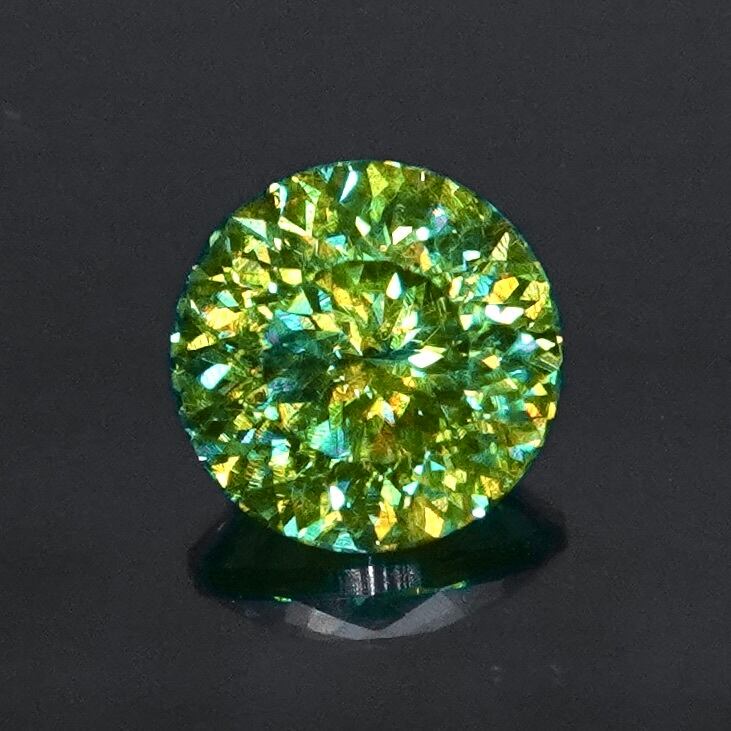 ファセットの一つひとつが光を捕らえては反射し、黄と緑の間を絶え間なく行き来する。