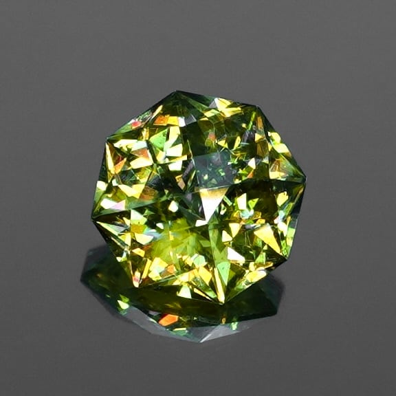このスフェーンは、グリーンを帯びた鮮やかなイエローを基調としながら、光の中で次々と表情を変えていきます。