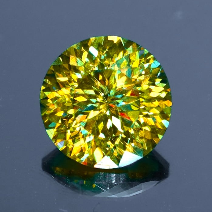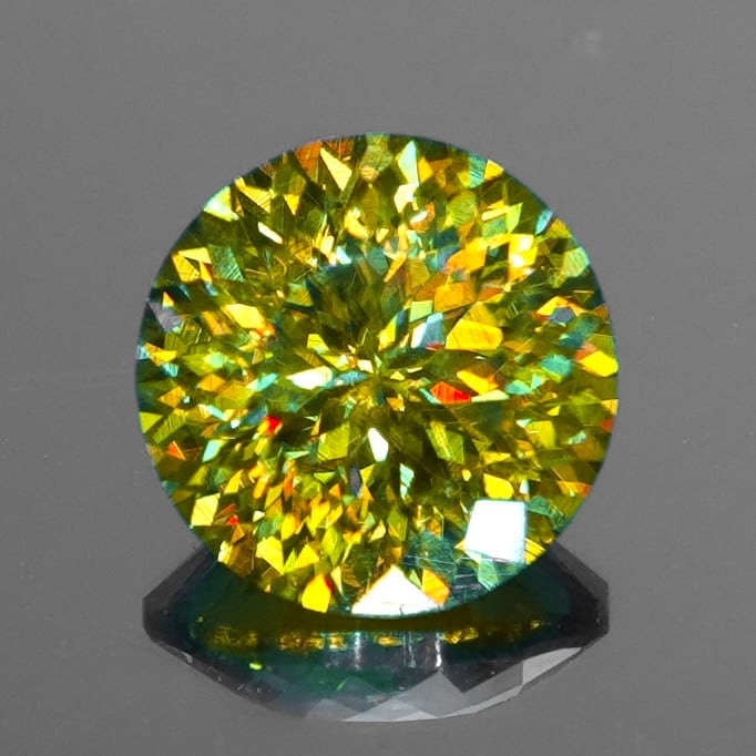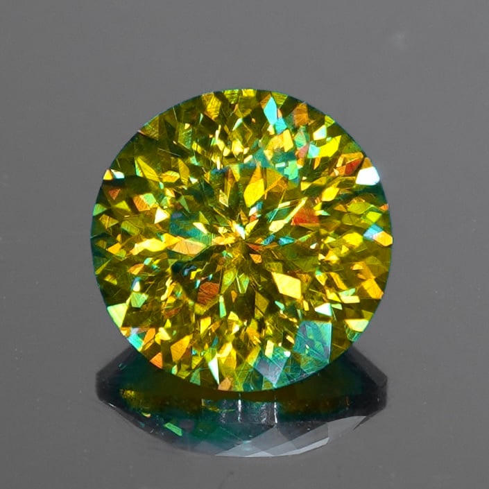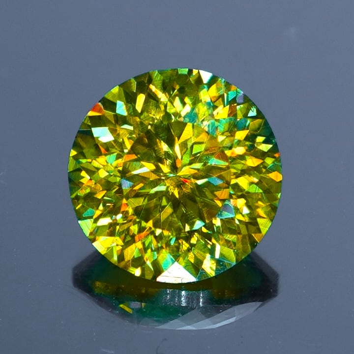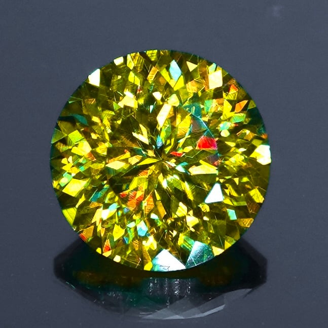 わずかに角度を変えるだけで、グリーンやオレンジ、赤や青といった極彩色の光が走り、結晶の内部で小さな光の爆発が起こります。