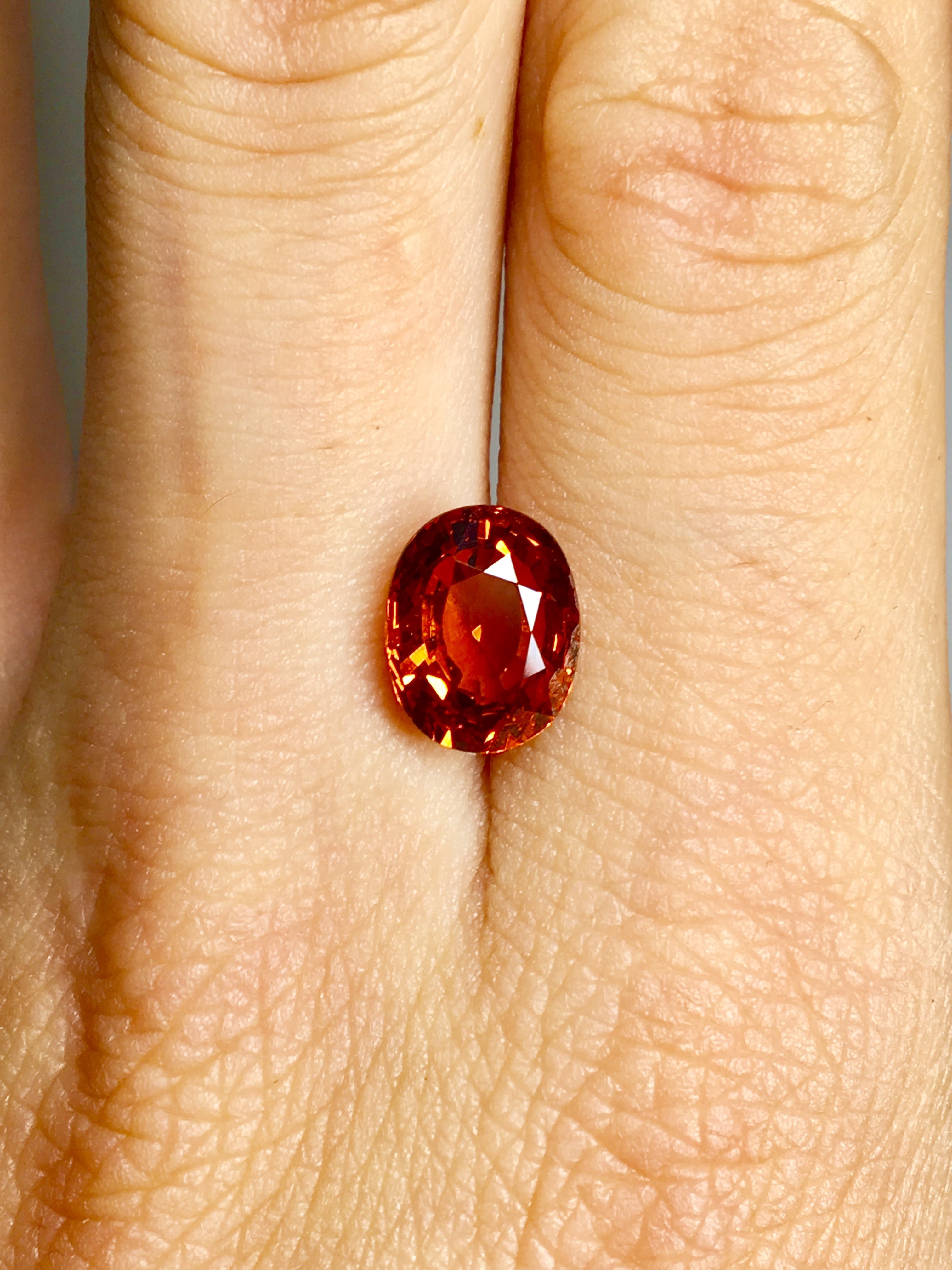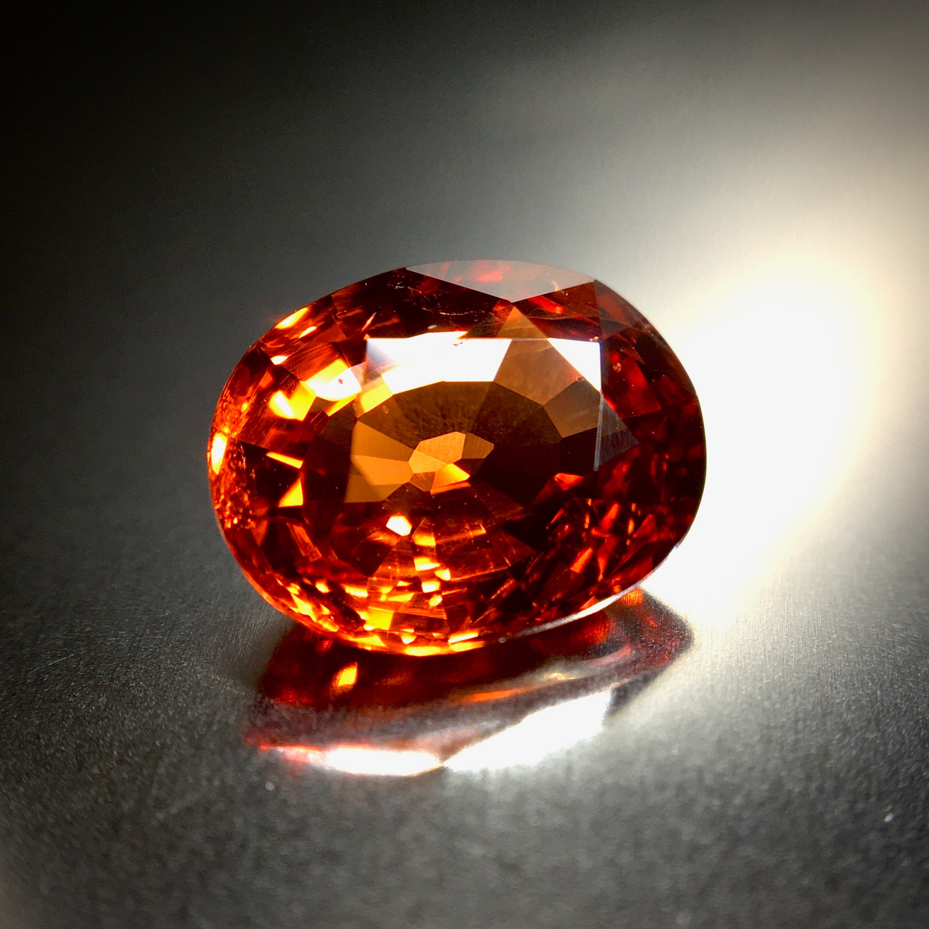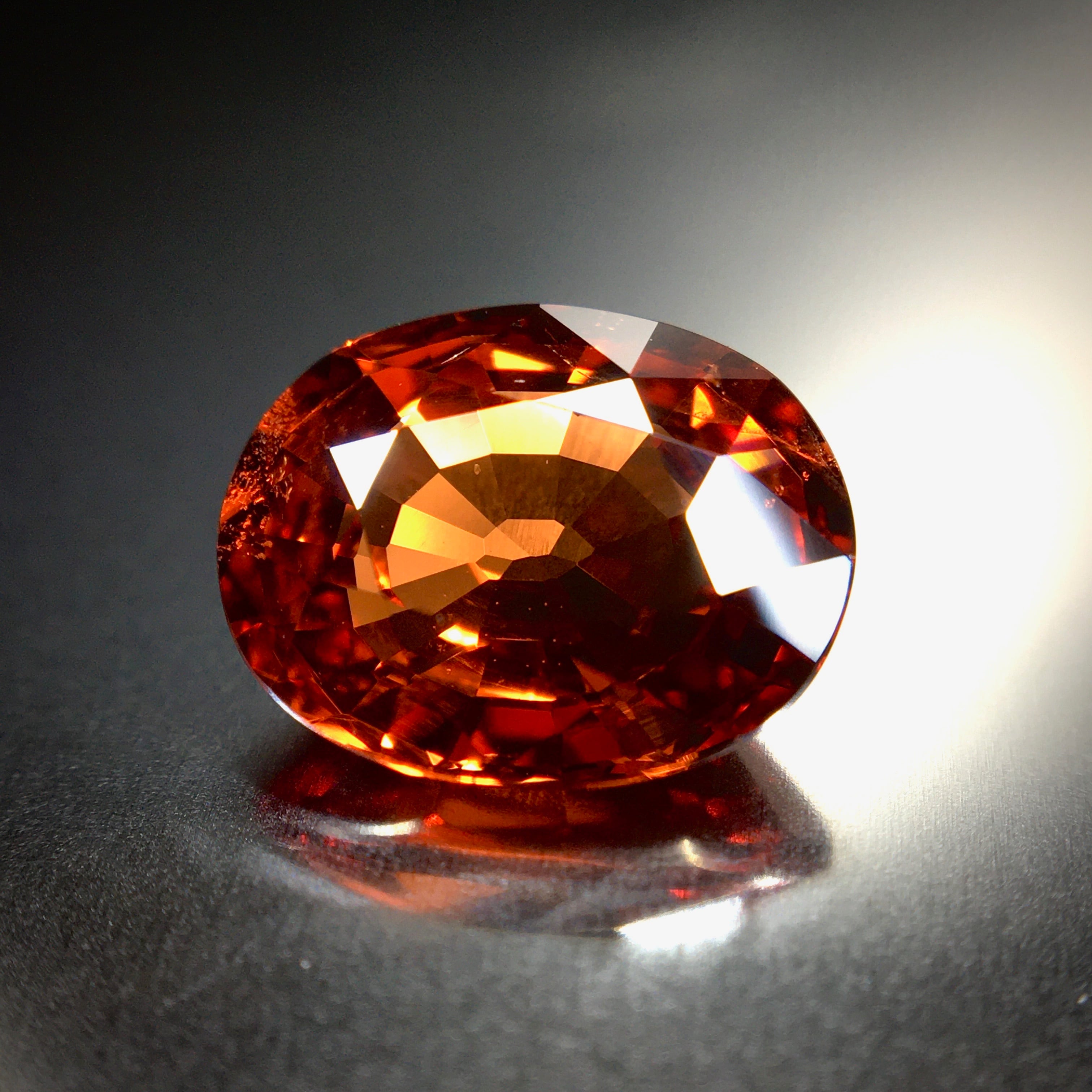 通常、マンダリンは顕著なインクルージョンを含みますが、この個体はルーペでも確認が難しいほどクリア。見事なマンダリンオレンジは、サファイアにもシトリンにもない、このガーネットでしか表現できないといっても過言ではありません。
