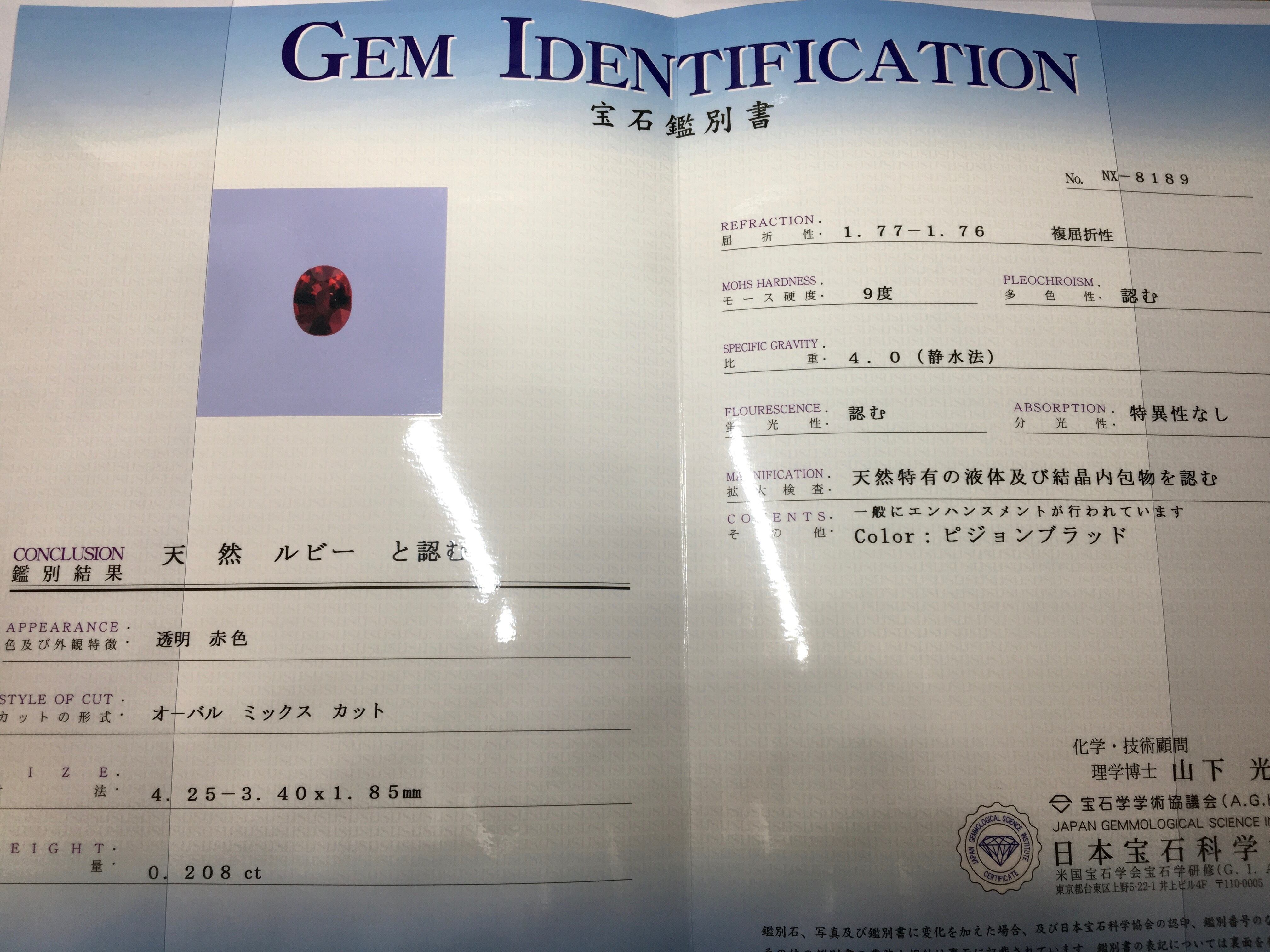 今回のストーンは、「ピジョンブラッド」の名称が記載された鑑別書が付属します。