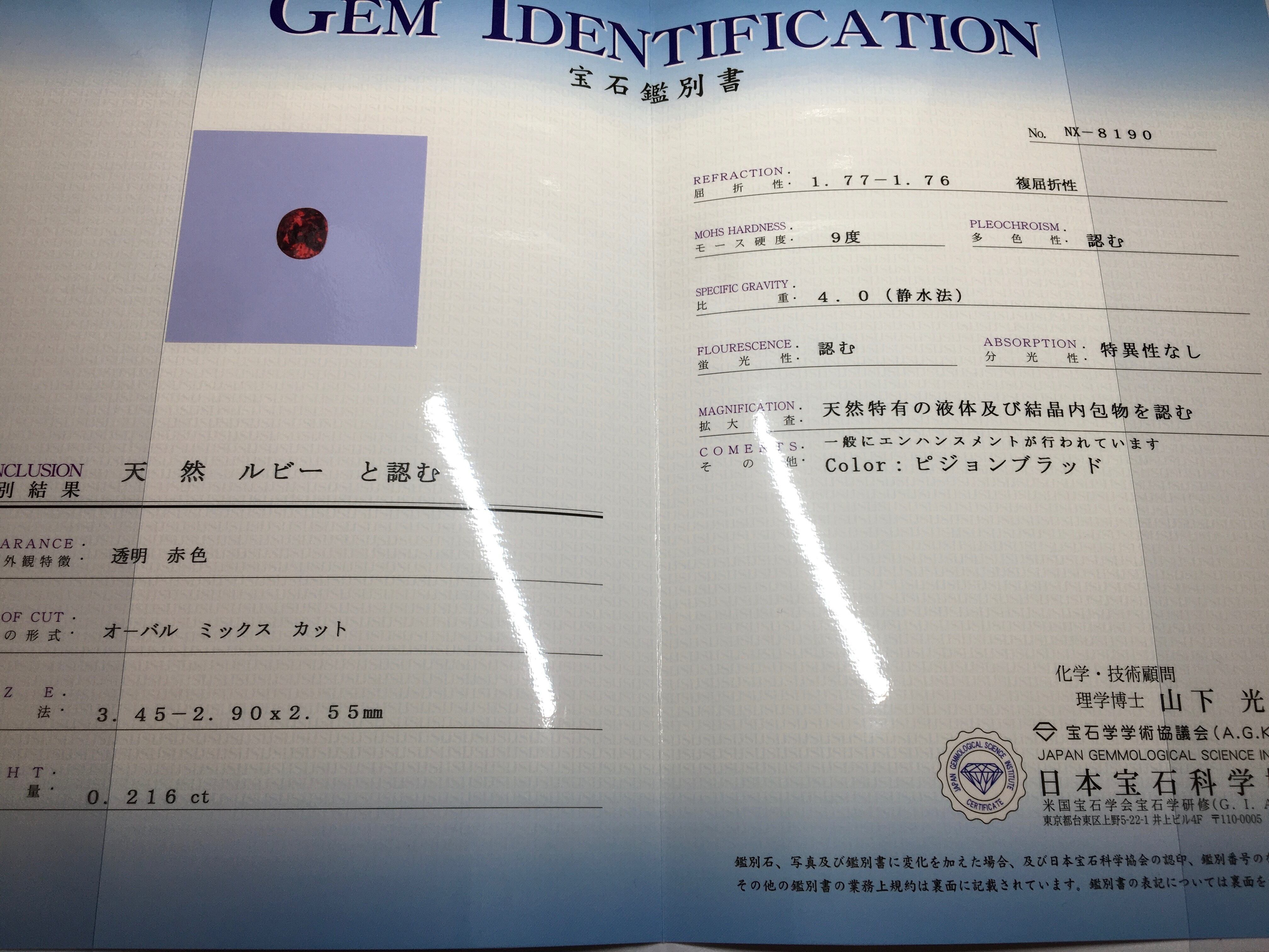 今回のストーンは、「ピジョンブラッド」の名称が記載された鑑別書が付属します。