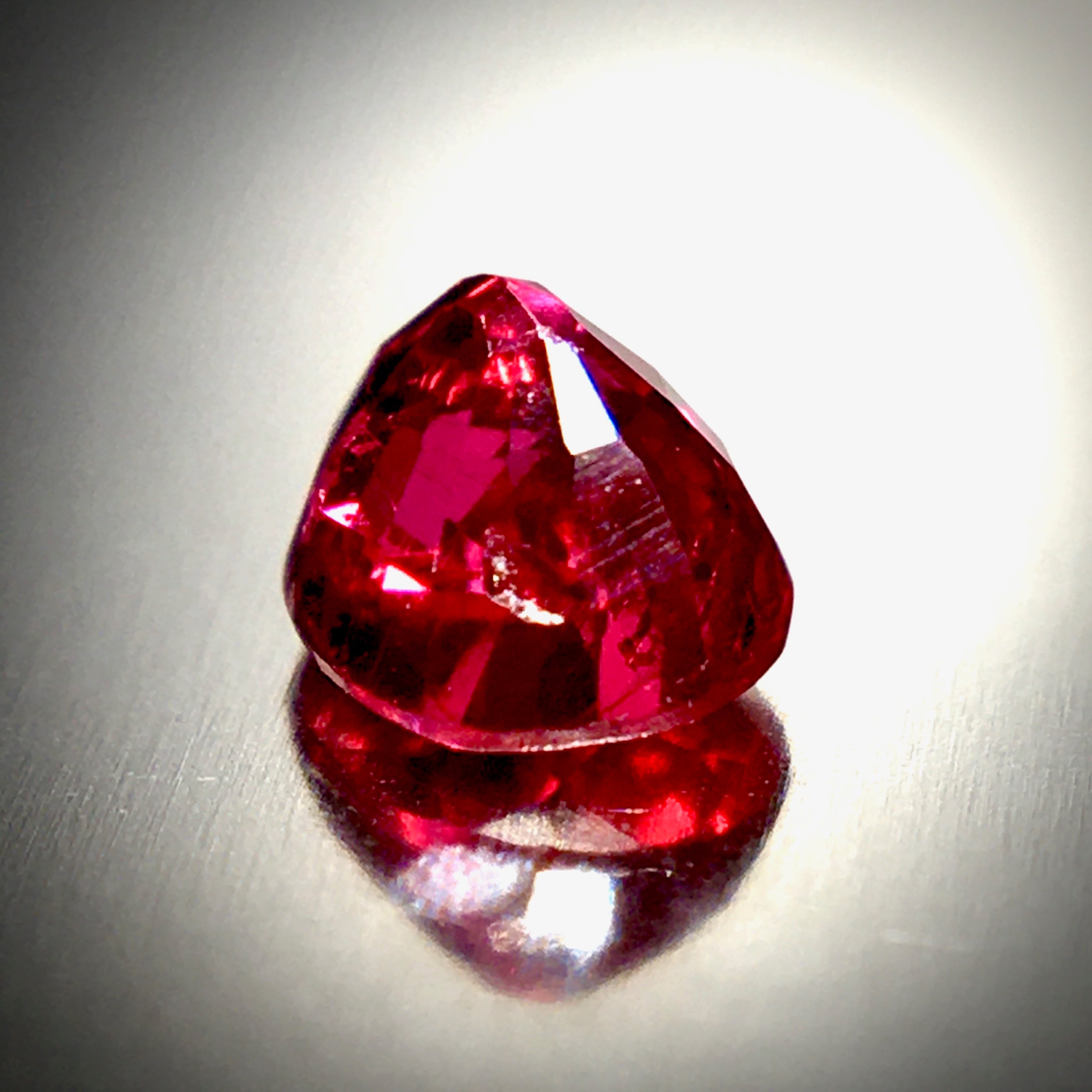 さて、今回のストーン、色の抜けもほとんどなく、精緻に施されたファセットからは深紅の輝きを放ちます。