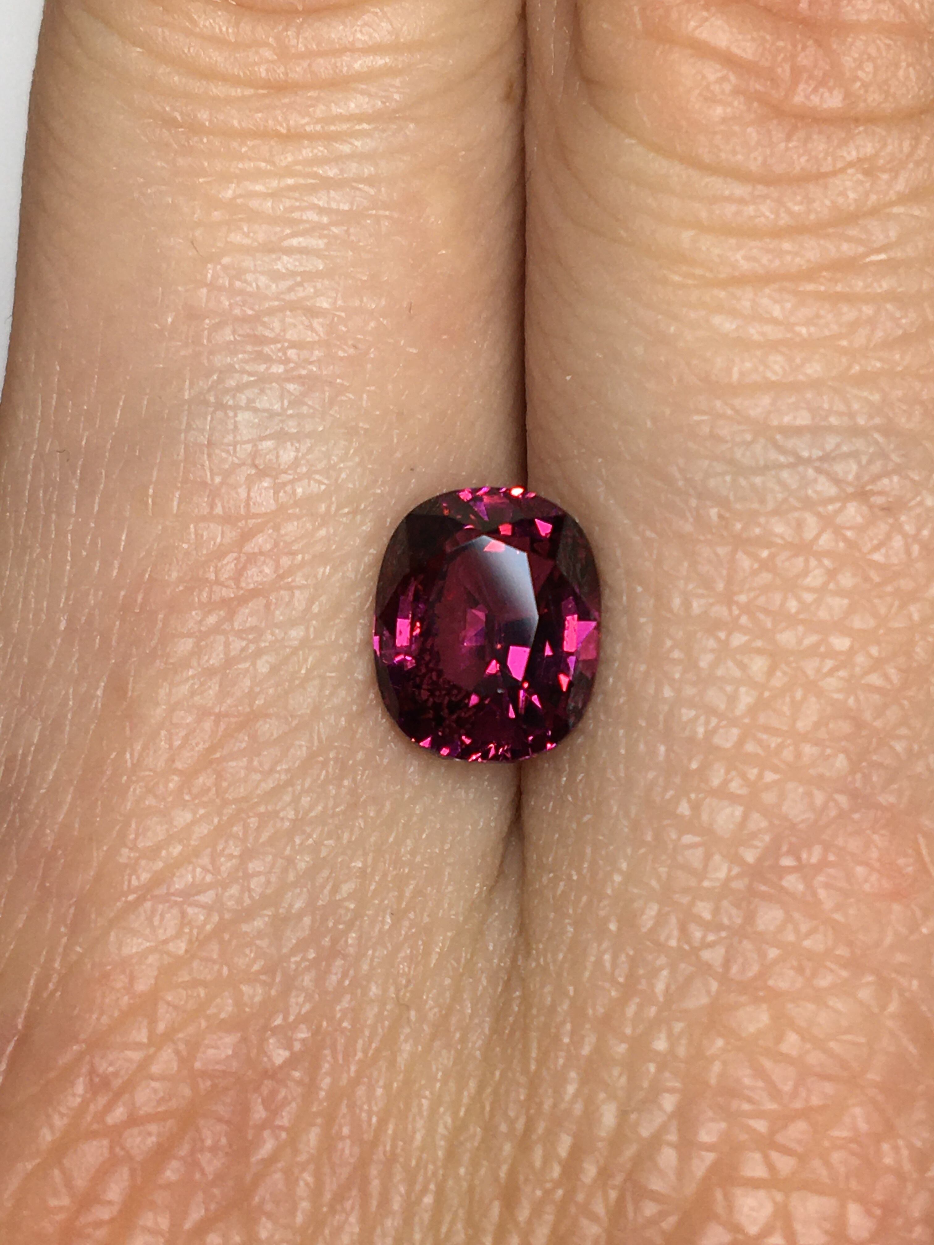 今回のロードライトガーネット、2ctを大きく超える大粒の一石。形の良いクッションカットが印象的です。