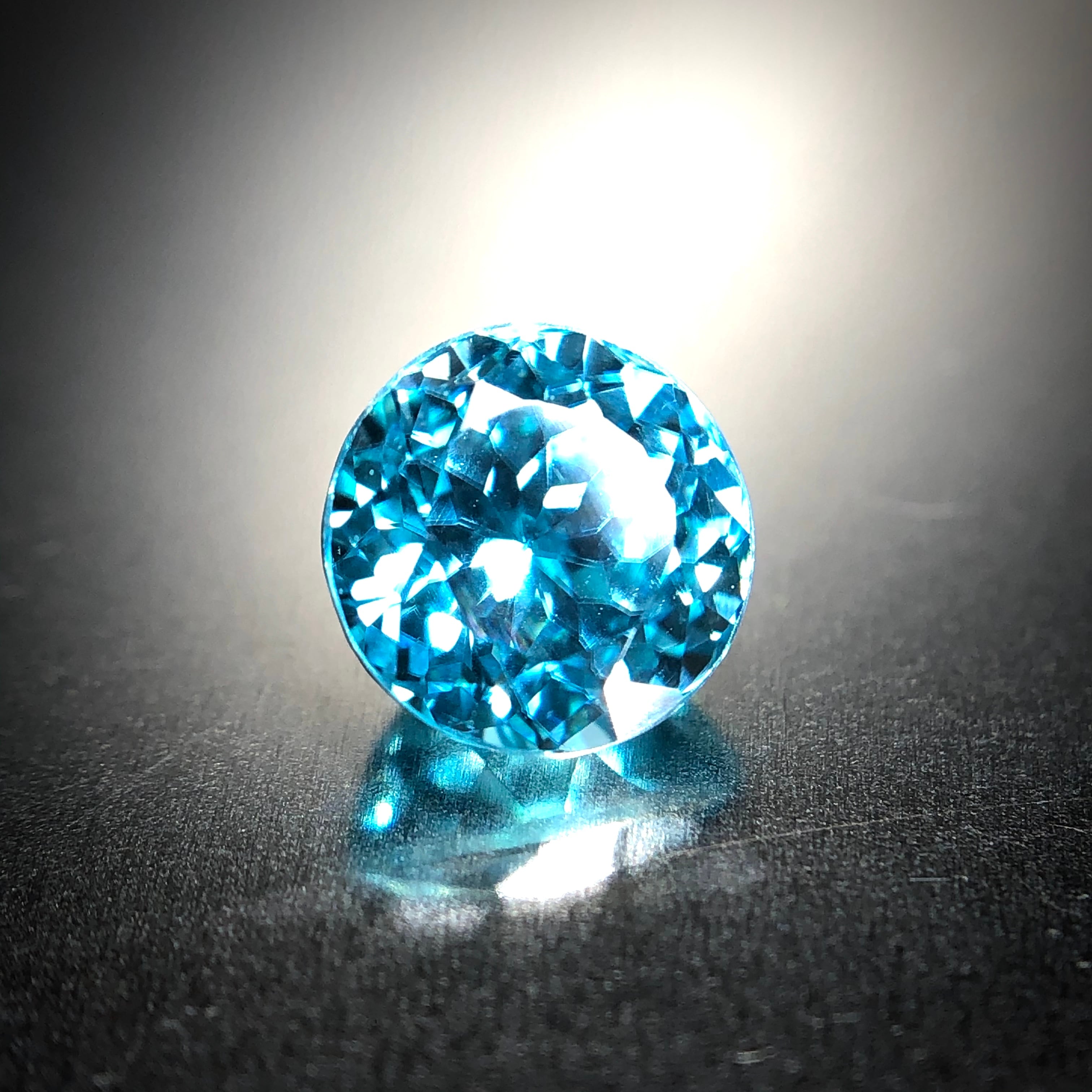 さて、今回のジルコンですが、工房のカスタム(オリジナル)カット。1.6ctアップと大粒で、美しい円形が印象的な逸品。このラウンドに施された、緻密なファセット配列により、色の抜けもなく、眩しいほどのブリリアンスを生み出します。
