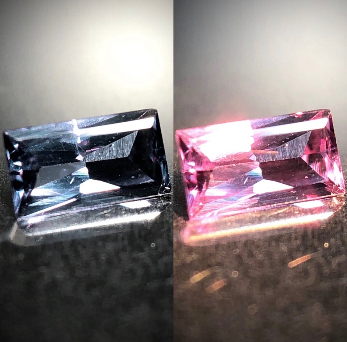 LED下では落ち着きのあるバイオレットブルー、そして白熱灯下では可愛らしいレディッシュパープルを呈し、角度を変える度、宝石内部からラズベリーレッドのブリリアンスが放たれます。クールなバイオレットブルーと、情熱的な赤色の印象で魅了します。