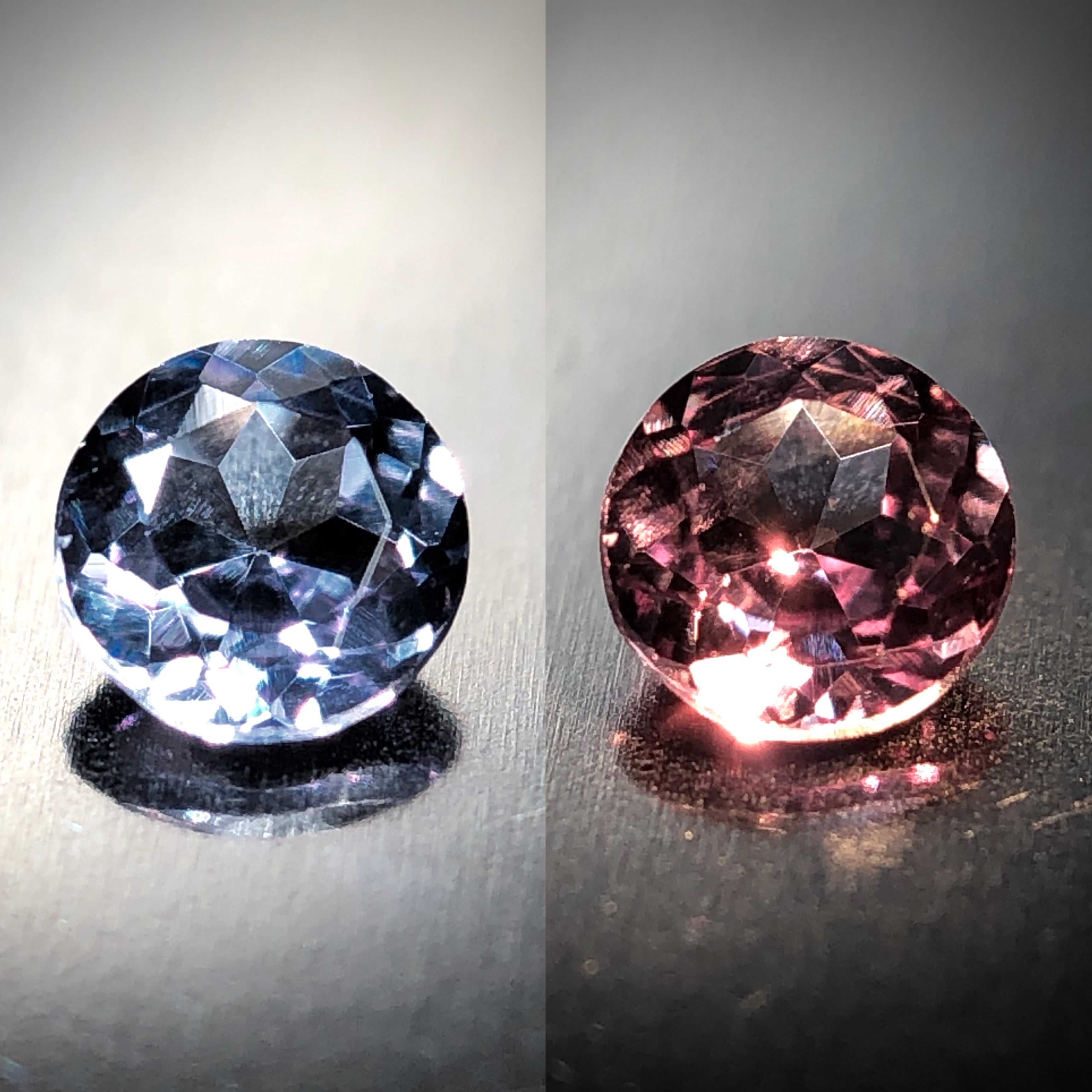 LED下では落ち着きのあるバイオレットブルー、そして白熱灯下では可愛らしいレディッシュパープルを呈し、角度を変える度、宝石内部からラズベリーレッドのブリリアンスが放たれます。クールなバイオレットブルーと、情熱的な赤色の印象で魅了します。