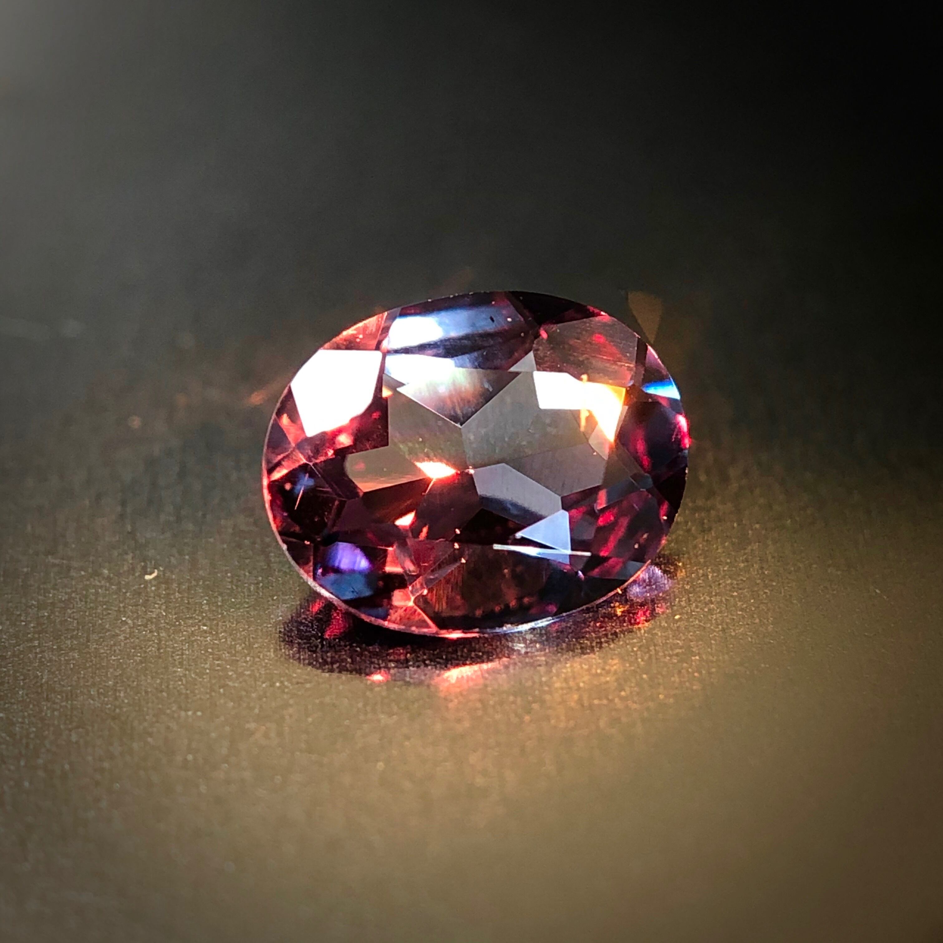 LED下では落ち着きのあるバイオレティッシュ〜グリーニッシュブルー、そして白熱灯下では、レディッシュパープルを呈し、角度を変える度、宝石内部からラズベリーレッドのブリリアンスが放たれます。クールなバイオレットブルー〜グリーニッシュブルーと、情熱的な赤色の印象で魅了します。