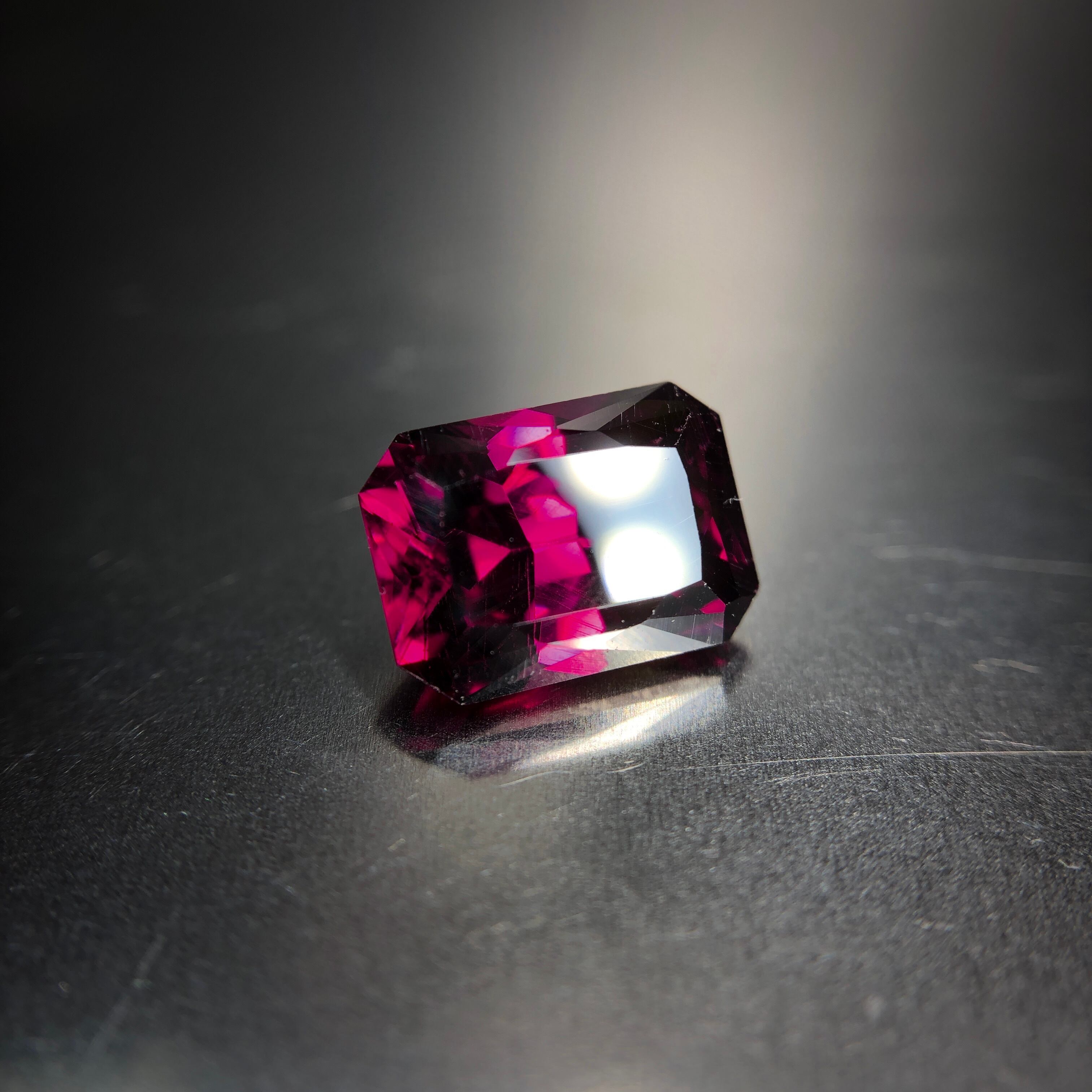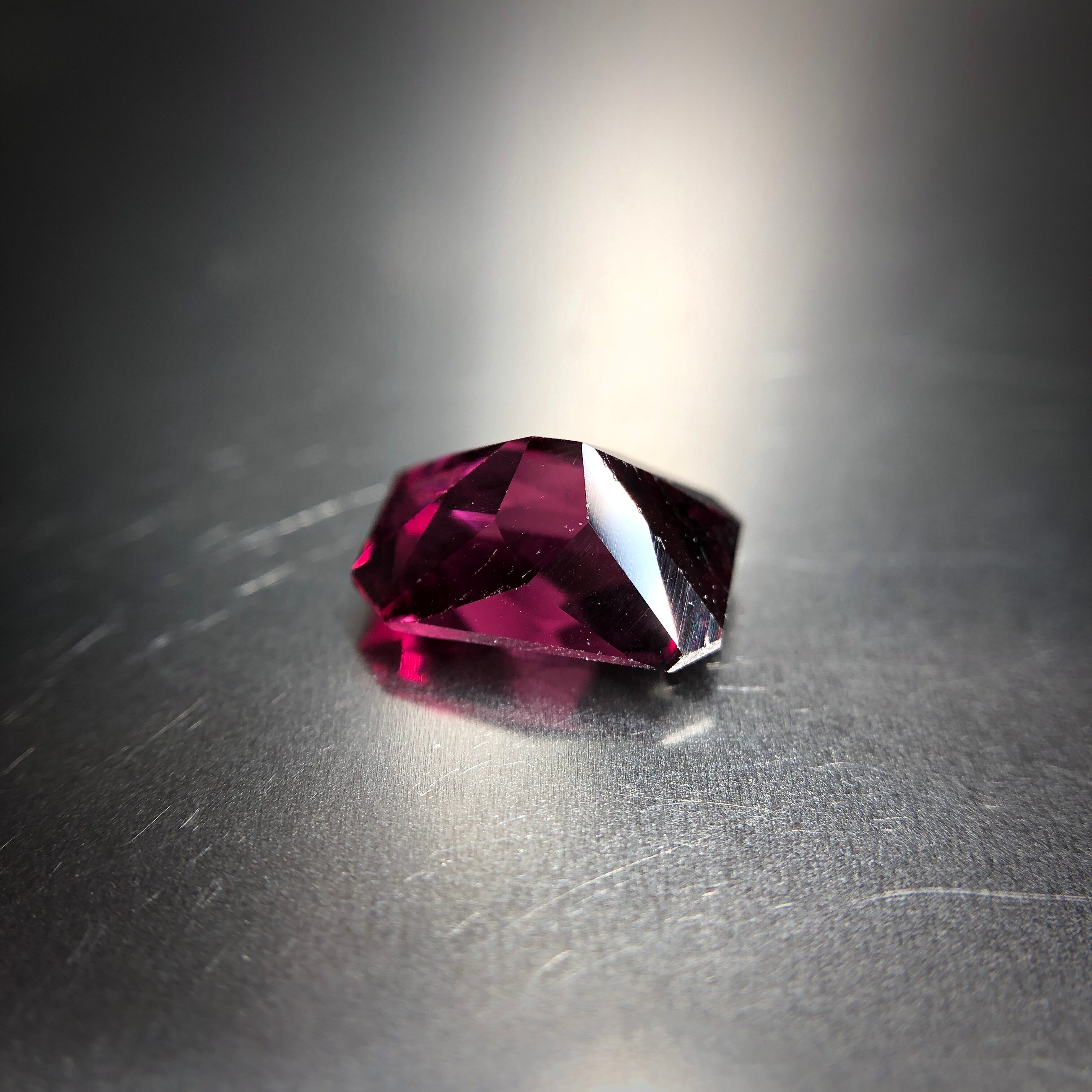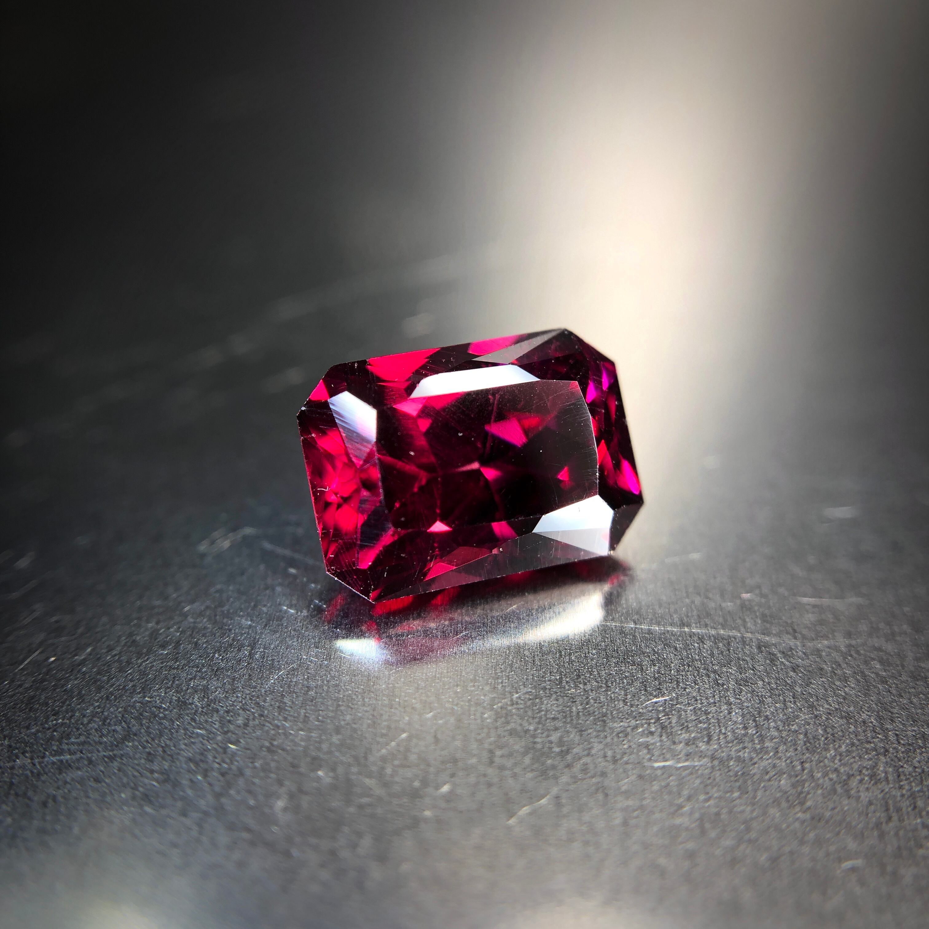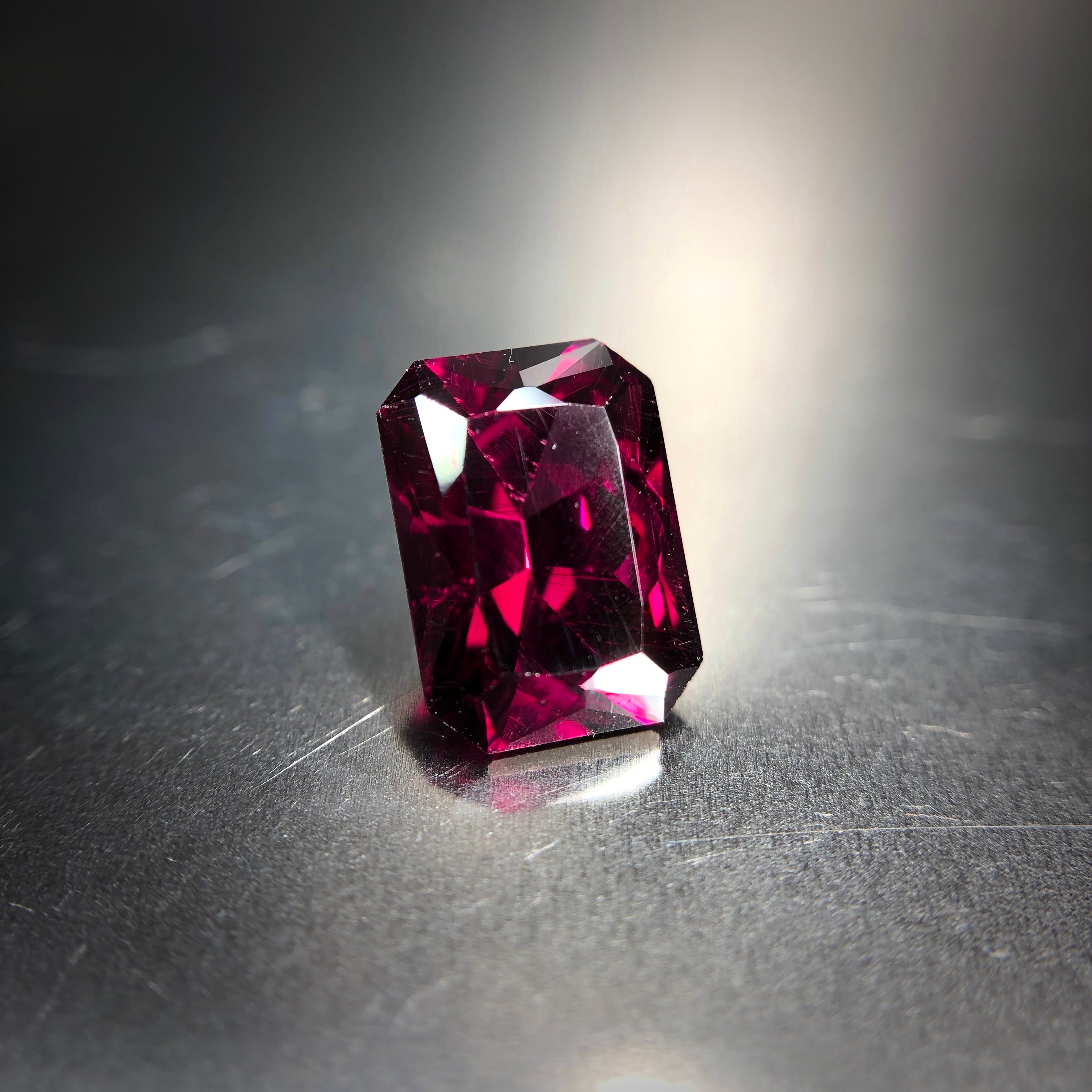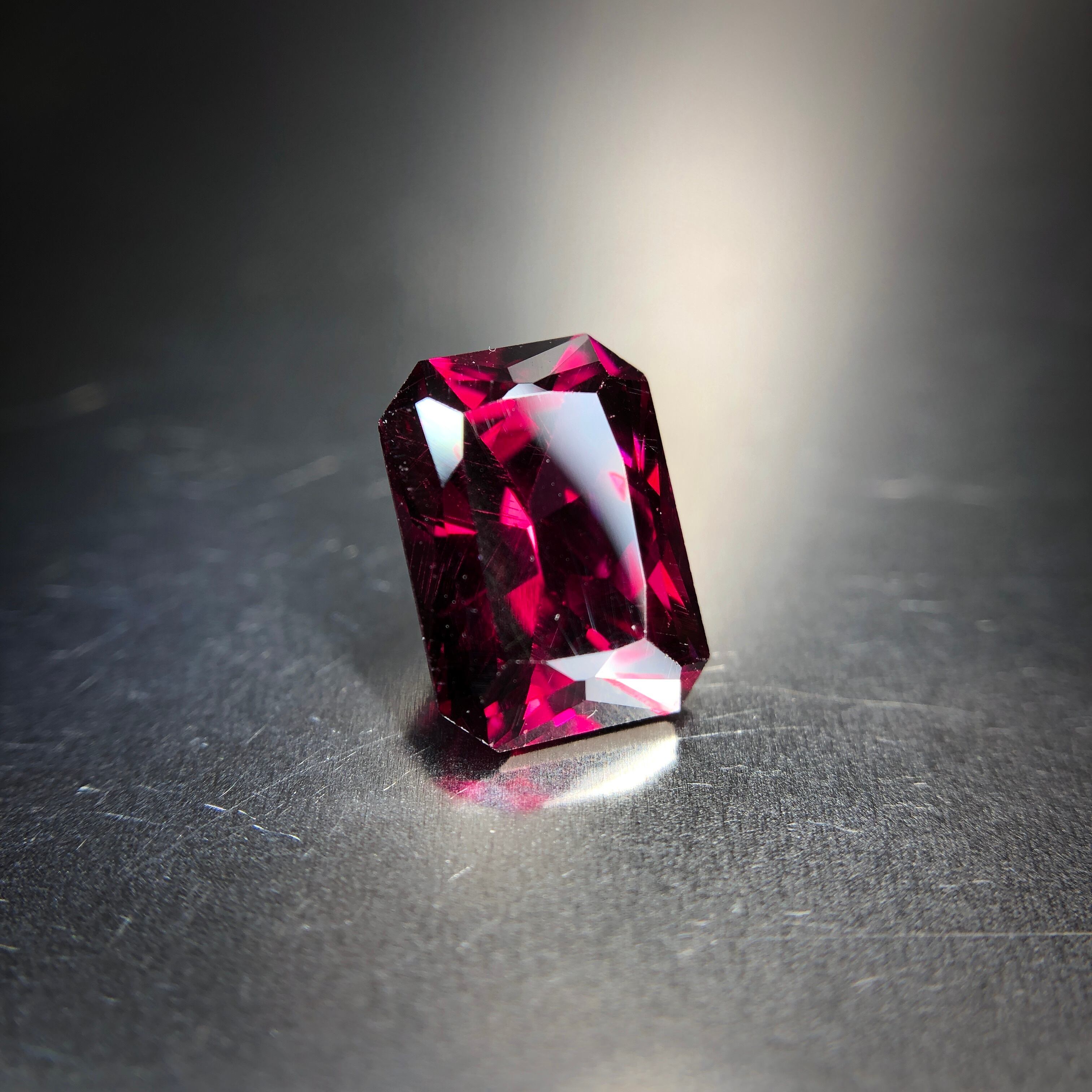 通常、ガーネットで長方形のカットというと、歩留まり率の関係上エメラルドカットが多いものの、こちらは美しさを優先させ、オクタゴンのシェイプに多くのファセットを配しています。