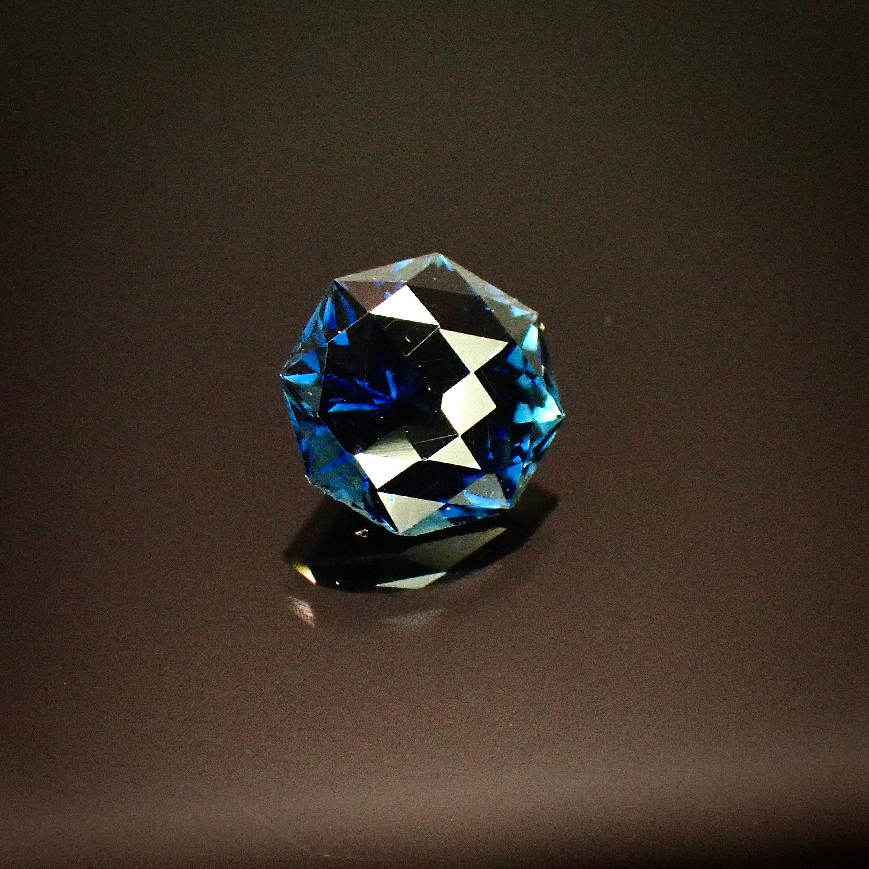 今回は”星”をイメージして、端正なオクタゴンに石取りを行いました。クラウンの中心からトライアングル形のファセットを直角にびっしりと敷き詰め、研磨を行なっています。