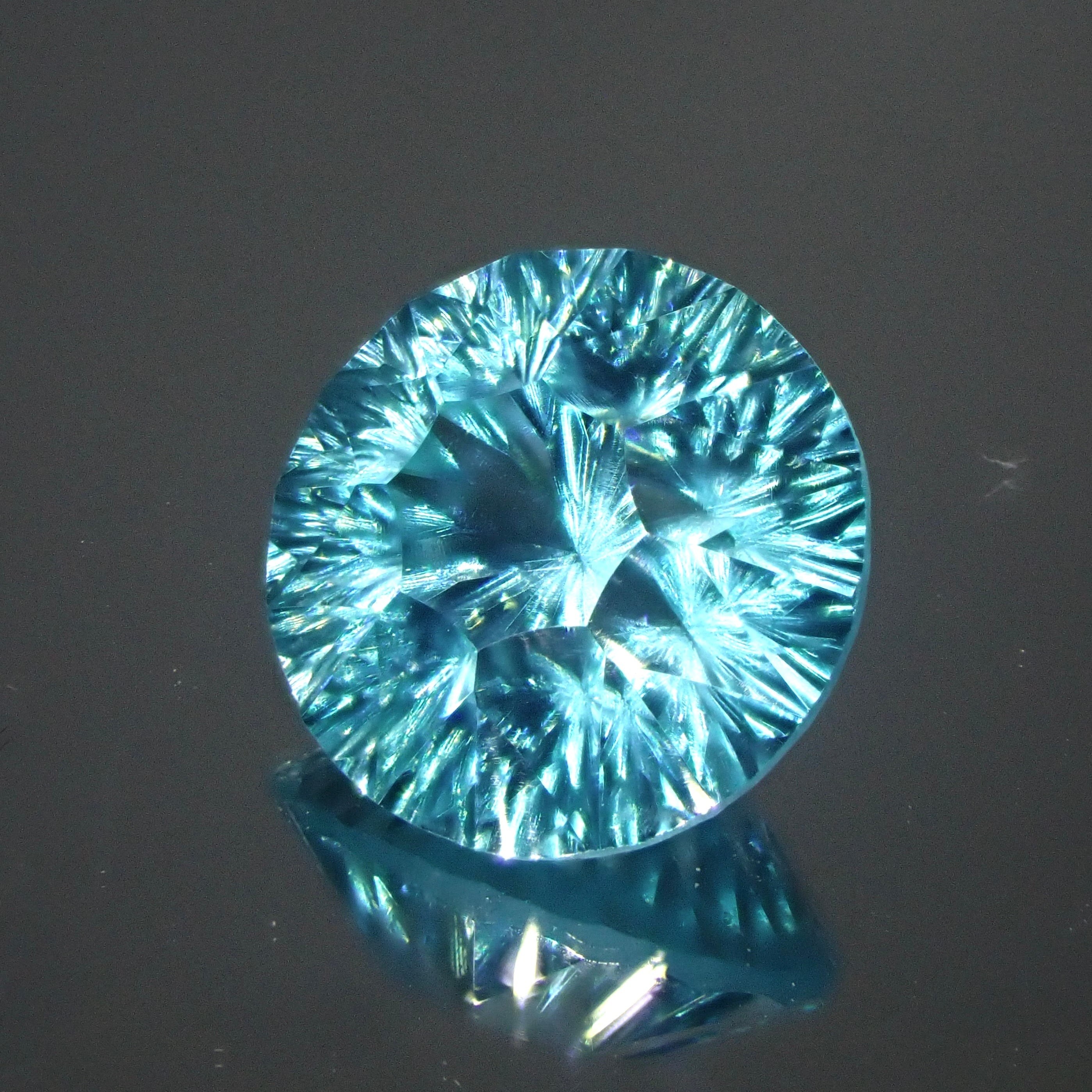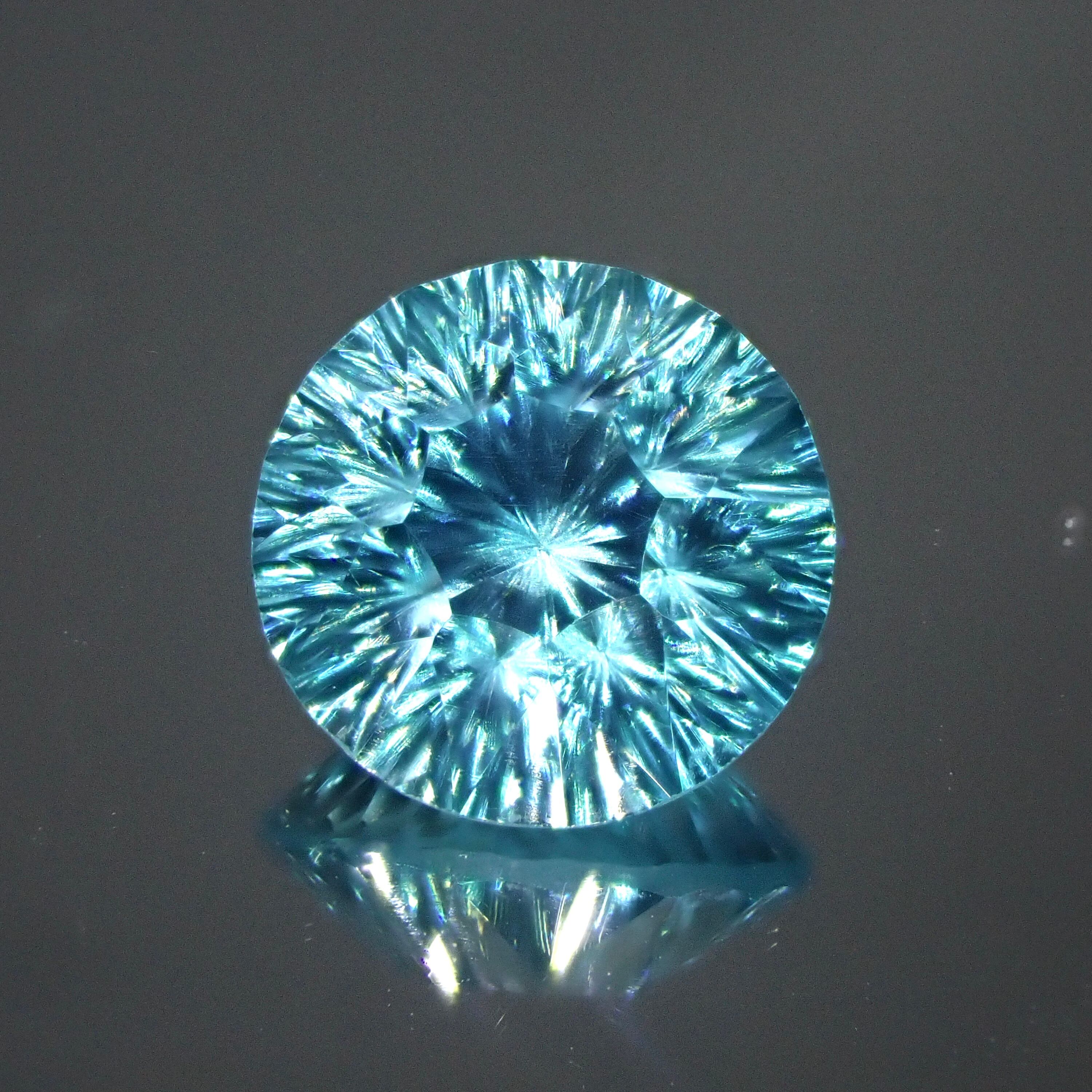 このブルージルコンは、原石の自然美を最大限に生かしつつ、緻密な計算と情熱的な手作業で仕上げられたものです。